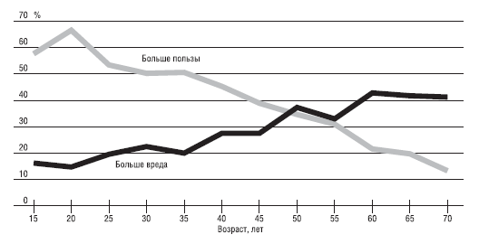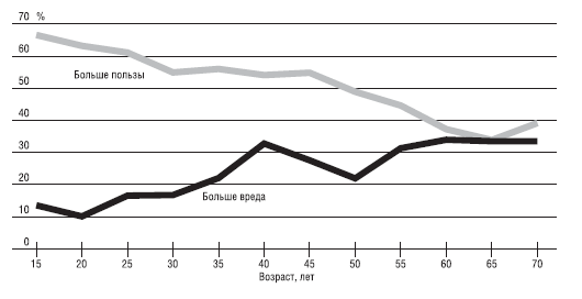 Свобод а предпринимательства представляется, скорее, полезной до 50 лет, в более старших группах ее чаще оценивают как вредную (рис. 3).