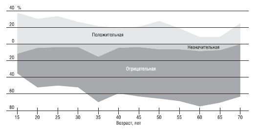 Наконец, обратимся к возрастной разбивке ответов о том, как люди «устраивают свою жизнь в переходное время» (ноябрь 1994 года). Наибольшая частота ответов типа «не могу приспособиться», а также «ничего не изменилось» приходится на старшие возрасты (после 65 лет). «Пик» успеха («удается использовать новые возможности, начать серьезное дело, добиться большего в жизни») – это 20–30 лет; высота «пика», правда, всего 12–13 % от численности группы. А у 40-летних – максимум варианта «приходится вертеться, подрабатывать, браться за любое дело, лишь бы обеспечить себе и детям терпимую жизнь». Так отвечают более 40 % в этой группе (при средней по населению доле 30 %).