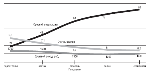 Повторю, что на рисунке I представлены возрастные группы современного населения, их соотнесение с определенными поколениями истории XX века носит условный характер. Для наглядности соотнесены графики изменения разных величин – годы, рубли, балльные оценки статусов.
