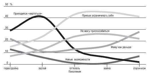 Сколько-нибудь активное отношение к жизни свойственно только двум наиболее молодым поколениям (охватывающим, правда, почти все работающее население), причем «повышающая» активность («новые возможности») почти полностью сосредоточена в одной, «перестроечной» поколенческой группе. Чаще всего приходится «вертеться», подрабатывать и т. д. (понижающая адаптация) «детям застоя», сформировавшимся в годы стабилизационной стагнации. Для «детей оттепели» и более старших поколенческих групп наиболее характерные позиции – «привык ограничивать себя» (около половины опрошенных) и «не могу приспособиться» (около четверти). Представляет интерес возрастная динамика позиции «живу как раньше»: здесь максимальные (и довольно близкие – 22 % и 27 %) значения наблюдаются в самых молодых и самых старших группах. У первых все только начинается, нет базы для сравнений. Среди самых старших более четверти не видят изменений в своем положении – это пенсионеры, домохозяйки, среднеобеспеченные.