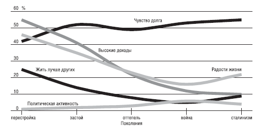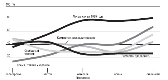 Бросается в глаза параллельность изменений двух показателей социальных установок: распространенности представлений о том, что «лучше было бы, чтобы все в стране оставалось как до 1985 года» и что в годы правления Сталина было «больше хорошего, чем плохого». Притом что сами эти показатели для всех поколений, кроме самого старшего, существенно различны. В обеих кривых можно отметить два перелома: в период «оттепели» и в период войны. Представление о том, что «коммунистическая партия дискредитировала себя», разделяет примерно половина самых молодых, для военного поколения эта величина уменьшается до одной трети, но в собственно «сталинском» поколении вновь возрастает почти до половины (последнее, видимо, связано с непосредственным восприятием репрессий старшей группой и пр.). Установка на продолжение экономических (рыночных) реформ, преобладающая у двух младших поколений, вдвое реже встречается во всех других группах, начиная с «оттепельной».