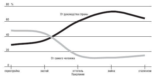 На рисунке 4 представлено как будто примитивное, но довольно показательное выражение принципиальных социальных установок, дифференцирующих возрастные группы. Доминирующая в активных поколениях демонстративная установка на собственные силы («благосостояние зависит от самого человека») – важная черта, отделяющая эти группы от старших поколений, примета своего рода «разгосударствления» человека.