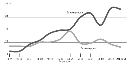 Отметим некоторые возрастные особенности партийных электоратов. Для удобства в данном случае учитываются только крайние позиции – поддержка коммунистов (КПРФ) и демократов («Яблоко» и СПС); симпатии к центристам, или «партии власти», не принимаются во внимание.