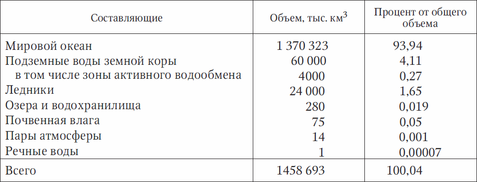 Общее количество воды на Земле (гидросфера) составляет примерно 1,5 млрд км3. Однако основная ее масса (около 94 %) представлена соленой водой океанов и морей. На долю пресной воды приходится менее 2 % и сосредоточена она в основном в ледниках Гренландии и Антарктиды. Таким образом, для использования в хозяйственно-питьевых целях доступно менее 0,2 % от общего количества воды – это вода рек, озер, водохранилищ, почвенная влага, пары атмосферы и верхние водоносные горизонты земной коры (табл. 1).