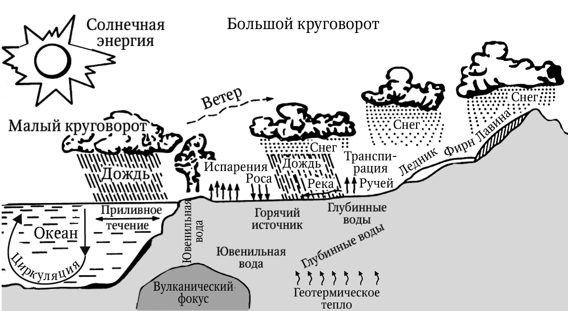 Земная вода находится в постоянном кругообороте. Под влиянием солнечной радиации с поверхности океанов, морей, рек, озер, почвы и растительности ежегодно испаряется 525 тыс. км3 воды. Большая часть этой влаги выпадает в виде атмосферных осадков непосредственно на поверхность океанов и морей, совершая так называемый малый круговорот. Большой круговорот представляет собой многообразный процесс перемещения, расходования и возобновления влаги на земной поверхности, в недрах земли и в атмосфере. Атмосферные осадки, орошая поверхность материков, частично просачиваются в почву, частично стекают по склонам и образуют ручьи, реки, озера, болота. Поглощенная почвой вода частью испаряется, частью просачивается вглубь и формирует подземные воды. Последние участвуют в питании рек, озер или достигают моря подземными путями. Упрощенная схема круговорота воды в природе представлена на рис. 1.