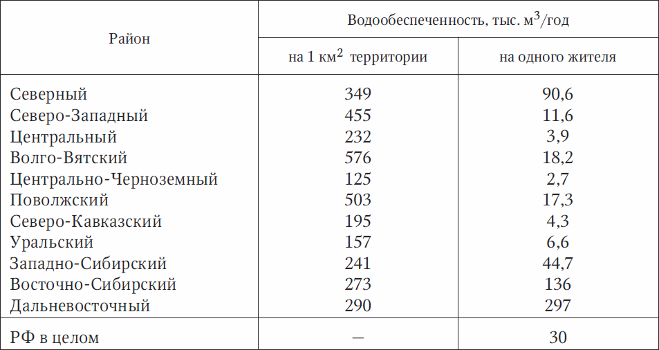 Таблица 2. Водообеспеченность экономических районов России (Государственный доклад «Вода питьевая», 1995)