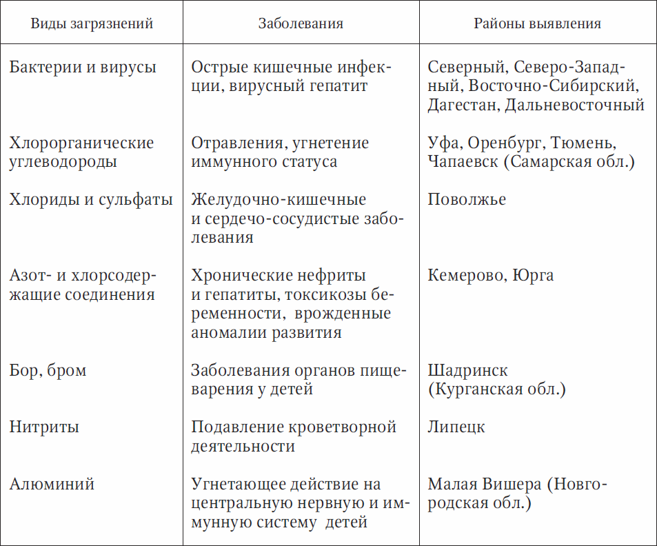 Таблица 3. Заболевания, связанные с потреблением некачественной воды (Рахманин Ю. А. и др., 1995)