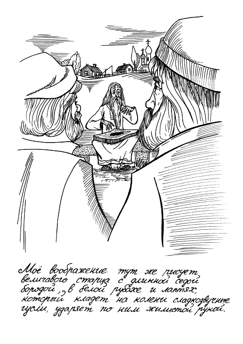 А уж когда доходило до праздников, песню и вовсе было не удержать! Мое воображение тут же рисует величавого старца с длинной седой бородой, в белой рубахе и лаптях. Вот он кладет на колени сладкозвучные гусли, ударяет по ним жилистой рукой – и над зачарованными слушателями, окружившими сказителя, разливается старинная песня. Предположим, такая: