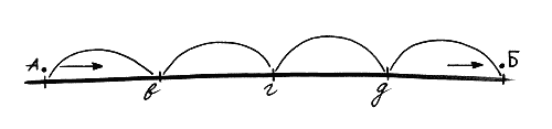Итак. Возьмем чистый лист бумаги, мысленно согнем его пополам и поставим точку слева от воображаемой линии изгиба. Назовем ее точкой А. Затем поставим точку справа от той же линии и назовем ее точкой Б. Потом возьмем линейку и нарисуем стрелку от точки А до точки Б, не просто линию, а именно стрелку. С помощью линейки разделим расстояние от А до Б на четыре части, таким образом получив еще три точки, которые назовем в, г и д слева направо соответственно.