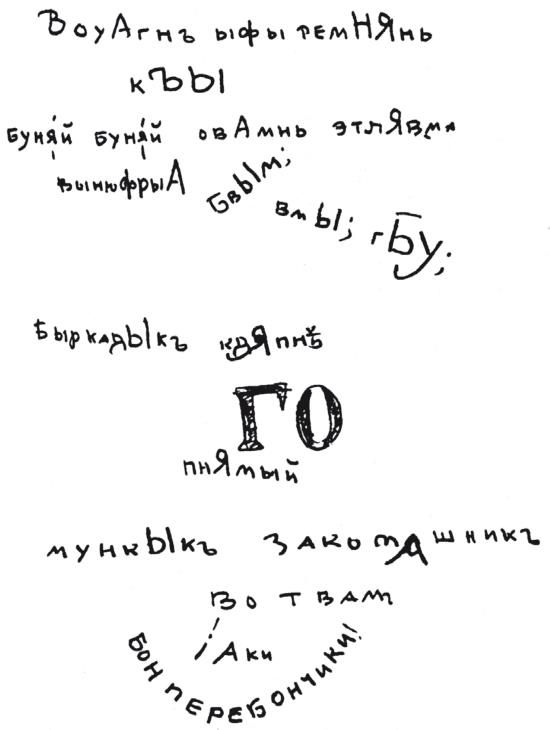 Я получил от благодарных иностранцевОбратный календарь из бабьей чешуиВ ответ запел собственным голосом.Хмык Ыхлык ым мыкышкаЯак ВувоАньТЕ не ВыпустиСтойи всё-таки потерял подарок<1919–1920>