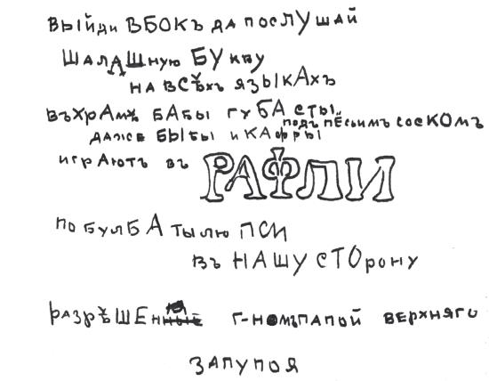 Я трЕТью ШмАмку вЫездилНа мундШТУкЕГренлАндских АпмистровНо мне никтО не поВЕрилХотя не хАн Я стАнуСтАну моНАхомно где ДОСТАНУ вЫшитые сильВЕстрами ШтАнЫ<1919–1920>