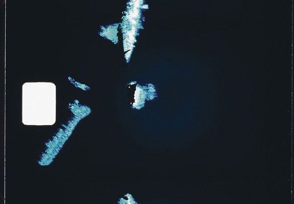 Когда пленку зарядили в проектор – а эта уникальная копия, к счастью, все еще абсолютно годна к проекции, – экспериментальные жертвы Марка обернулись прекрасной анимированной абстракцией. Но на деле они представляли собой куда больше. Сорок лет назад зубы Марка не просто «прошлись» по эмульсии пленки Super 8, а глубоко воздействовали на основу последней, создавая глубокие царапины, вмятины и даже случайные отверстия, которые превращали якобы плоскую пленку в трехмерный объект.
