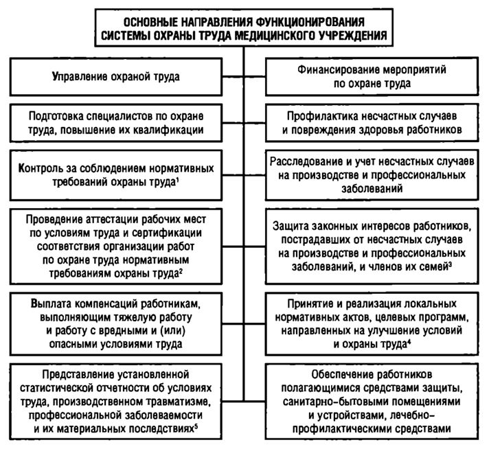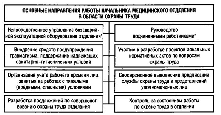 Общее руководство системой охраны труда осуществляет руководитель медицинского учреждения 8 . Непосредственная организация охраны труда (на соответствующих участках работы, рабочих местах) возлагается на должностных лиц медицинского учреждения, в том числе:
