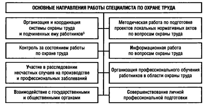 Основные направления работы специалиста (инженера) по охране труда представлены на рис. 4.2. Подробнее содержание его полномочий освещается в должностной инструкции, примерный текст которой представлен в приложении 2 14 к настоящему пособию. Там же представлен пример должностной инструкции специалиста 15 , которому делегированы полномочия по осуществлению контроля за состоянием указанной работы в медицинском учреждении.