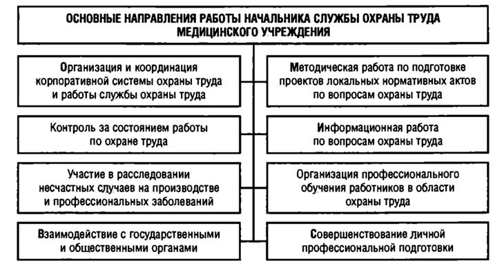 Основные направления работы начальника службы охраны труда медицинского учреждения представлены на рис. 4.1. Подробнее содержание полномочий начальника службы охраны труда освещается в его должностной инструкции, примерный текст которой представлен в приложении 2 12 к настоящему пособию.