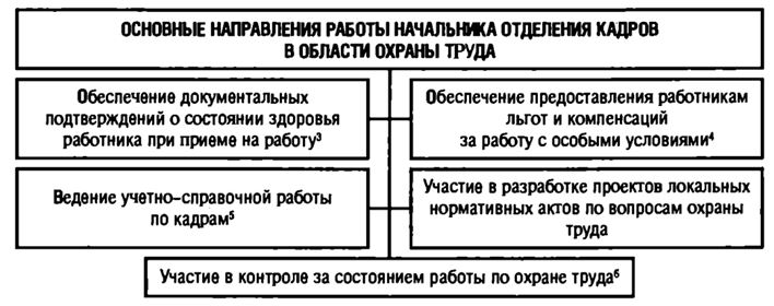 Полномочия по непосредственному руководству охраной труда работников медицинских и административных подразделений возлагаются на начальников этих подразделений. Основные направления работы начальника медицинского отделения (в области охраны труда) представлены на рис. 4.3, а начальника отделения кадров – на рис. 4.4. Подробнее содержание соответствующих полномочий освещается в разделах должностных инструкций, примерные тексты которых представлены в приложении 2 16 к настоящему пособию.