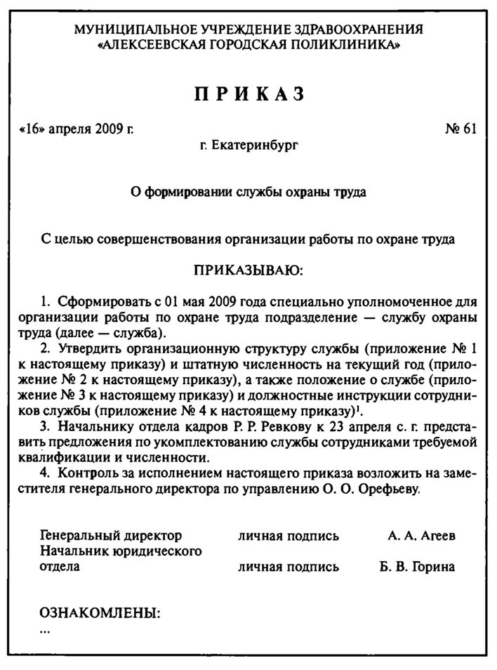 О формировании службы охраны труда руководитель медицинского учреждения издает соответствующий приказ. Пример приказа представлен на рис. 5.3. Этим же приказом, как правило, утверждается положение о службе, в соответствии с которым в дальнейшем осуществляется регламентация повседневной деятельности подразделе ния, а также должностные инструкции его работников 22 .