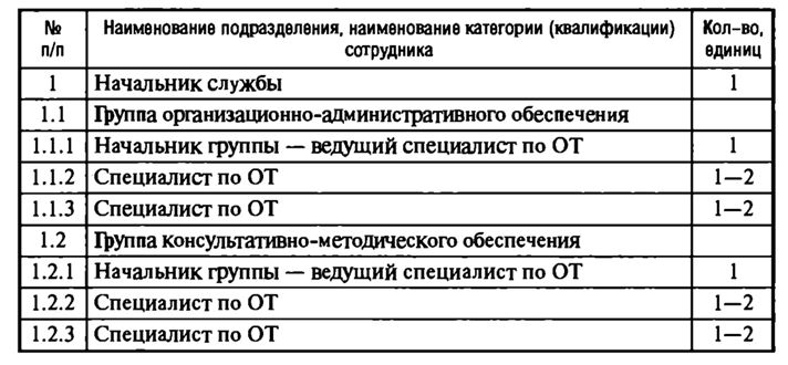 Примерный квалификационно-численный состав службы охраны труда медицинского учреждения представлен в табл. 5.1.