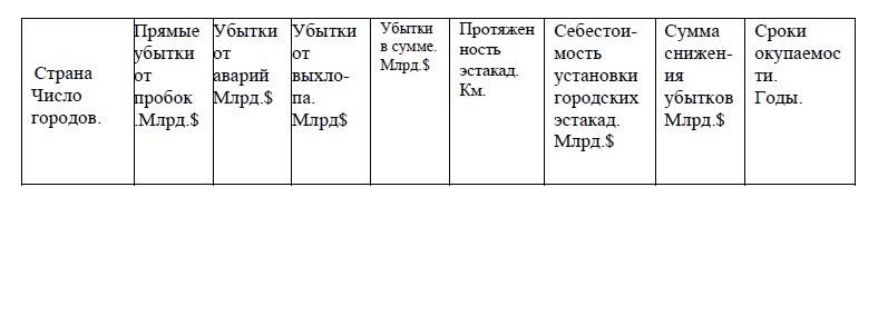 Из таблицы видно, сколь значимы потери, возникающие при отставании роста транспортной сети от роста продаж автомобилей даже в самых развитых странах мира. Следует отметить, что общие потери за год составляют по 404 крупным городам мира 11 стран $603 миллиарда, а срок окупаемости надземных сооружений в этих городах, обеспечивающих безостановочное движение практически любого числа автомобилей составляет только 1,2 года. Становится также понятным, что решение проблемы находится в увеличении пропускной способности магистралей в соответствии с ростом числа автомобилей и создании возможности для движения транспортных потоков без возникновения пробок.