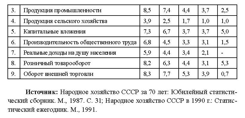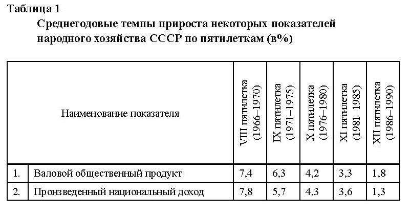 При достаточно высоких темпах роста основных показателей в СССР за последний 20-летний период имела место тенденция их ухудшения. Правда, следует подчеркнуть, что это было лишь снижение темпов роста в известной степени закономерное, поскольку по мере роста объема производства «вес» одного процента прироста становится более «значительным». Но падения экономики не было и стагнацией и топтанием на месте назвать это еще нельзя. Этот процесс был лишь отражением настоятельной необходимости структурной реорганизации производства, рассчитанной на интенсивное развитие новых отраслей и подотраслей. Промедление в этом деле неизбежно вынуждало экономику «перемалывать» ресурсы во имя поставок устаревшей, не пользующейся спросом продукции и предвещало будущий кризис.