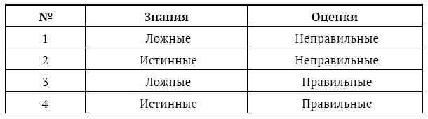 И знания, и оценки имеют определенную направленность в диапазоне «ложь – истина». Существуют следующие четыре варианта соотношения этих характеристик в зависимости от их истинности (Седова, 1997) (табл. 1).