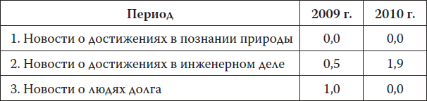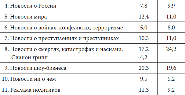 Итак, разбив новости на одиннадцать категорий, я проанализировал 525 топовых новостей (февраль – середина июня 2009 г.) и 365 топовых новостей (с конца декабря 2009 г. по середину марта 2010 г.). Результаты (в процентах) таковы:
