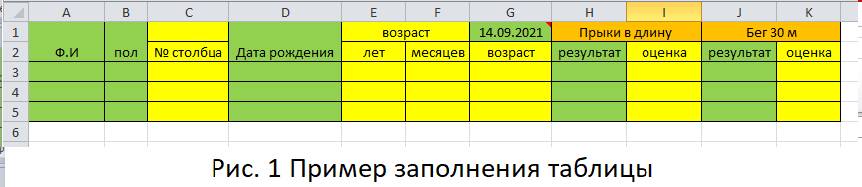 Ячейки, залитые зеленым цветом, заполняем данными учеников. В ячейки, залитые желтым цветом, вводим формулы.