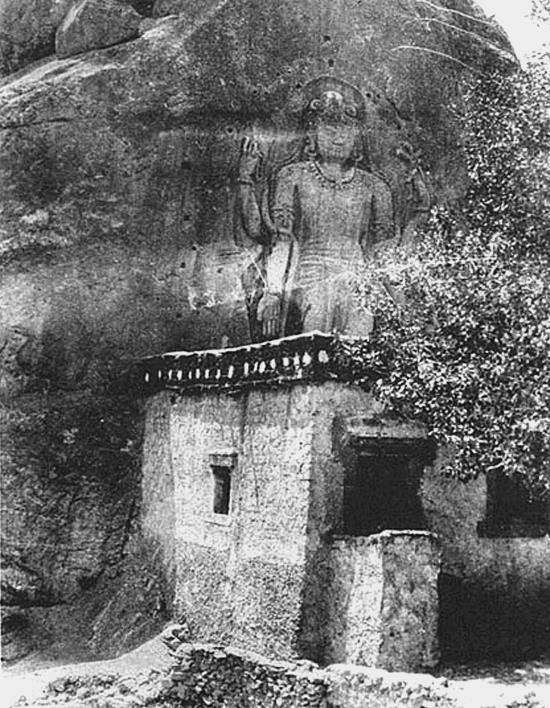 Однако главной достопримечательностью Мульбе является выбитая на камне колоссальная фигура Майтрейи. Впервые изображение было обнаружено и описано Муркрофтом в 1820 г. Оно представляет собой стоящего бодхисатву, высотой не менее двадцати футов. Бодхисатва облачен в одежду индийского аскета со священным брахманским шнуром, который отличает изображения бодхисатвы от женских божеств в подобных облачениях. Трудно сказать что-либо определенное относительно датировки этой статуи, но ее чисто индийское происхождение очевидно, и как памятник искусства она занимает выдающееся место среди каменных скульптур Ладака. Местное предание относит ее к эпохе великого лотзавы, или переводчика, Рин-чен-бцанг-по (Ратнабхадра, 964—1054). Я полагаю, что эта версия близка к истине и это каменное изображение бодхисатвы принадлежит к X–XI векам. Нижняя часть изображения скрыта за небольшим храмом, или лха-кхангом, построенным Вазиром Сод-намом, местным землевладельцем. Пожилой священник служит в часовне и возлагает цветочные гирлянды и топленое масло буйволицы к изображению, перед которым на низком алтарном столике горит жертвенная лампада. Стены часовни украшены фресками, представляющими «восемь великих сыновей Ньева», о которых говорят, что они высекли изображение. Хранитель принадлежит к старинному роду астрологов, и его обязанностью является быть продолжателем семейной традиции.