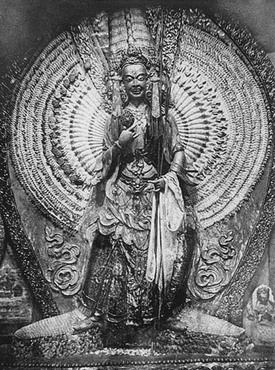 Оно выполнено весьма успешно ладакским художником. Тысячерукая богиня держит многочисленные символы своего могущества. Вдоль стен часовни висят знамена, некоторые из них старые и чрезвычайно интересные по своему стилю. Поскольку Ладак расположен на пересечении нескольких высокогорных азиатских путей, его культура и искусство несут на себе отпечаток космополитизма. Некоторые знамена раскрашены в индо-персидском стиле, а многие детали, по-видимому, заимствованы из монгольской миниатюры. Рисунок других очень напоминает один из известных живописных мотивов Китайского Туркестана. Мы долго рассматривали знамена в мерцающем свете свечей, так как кощунственно было нарушать полумрак часовни ярким светом карманного фонаря.