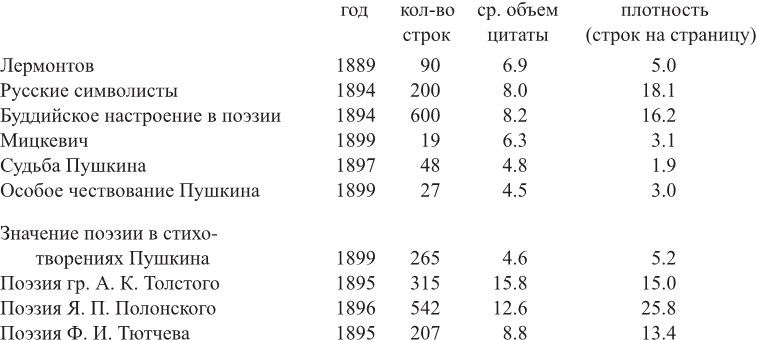 Таблица показывает, что больше всего строк процитировано в статьях о Голенищеве-Кутузове, Полонском и Толстом, меньше всего – в статьях о Пушкине и Мицкевиче; авторские мотивировки этого, очевидно, те же, что и при определении количества цитат.
