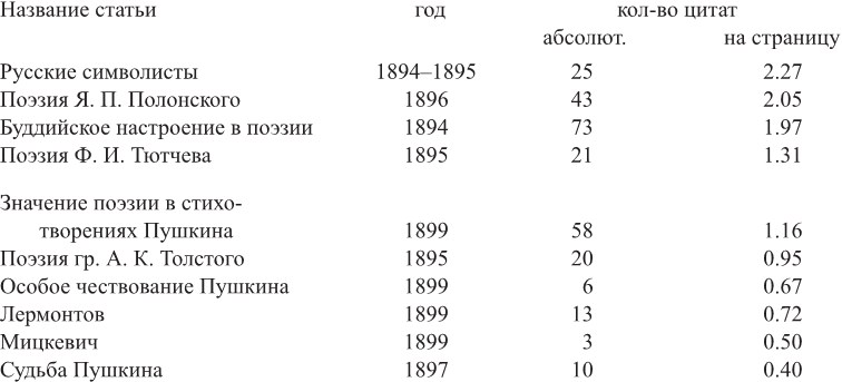Максимально насыщенными цитатами оказались статьи о Полонском, символистах, Голенищеве-Кутузове, Толстом и Тютчеве; самыми «нецитатными» – о Пушкине, Мицкевиче и Лермонтове; таким образом, можно констатировать, что абсолютные и относительные показатели цитатности по разным статьям имеют примерно одинаковый смысл: рассуждая об одних авторах (как правило, менее известных широкому читателю) Соловьев прибегает к их обильному цитированию, в то время как в статьях о более известных поэтах количество и объем цитат оказываются значительно меньшие.