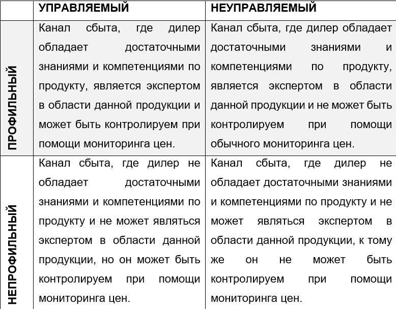 Неуправляемый профильный канал сбыта. Пример: Монтажники. Они являются большими экспертами на рынке, знают о технике фактически все, что только можно знать: и какая она может быть, и как ее можно применить на том или ином объекте (мало того, у них же могут быть «живые» примеры такого применения). Но вот проконтролировать цены, которые они выдают своим клиентам фактически невозможно. Или в принципе цена никогда не афишируется, или, что чаще встречается, сокрытие реальной цены продажи оборудования в принципе, то есть они в таком случае выставляют цену за монтаж с поставкой, и отследить где была цена Вашего продукта, где стоимость материалов, а где стоимость монтажа непонятно, все слито в кучу, или перераспределено таким образом, что Ваш продукт продается по бумаге по согласованной цене, а на деле потребителю очень выгодно приобретать именно у монтажника, так как ему пообещали монтаж и материалы бесплатно. Де-юре – все чисто, де-факто – демпинг.