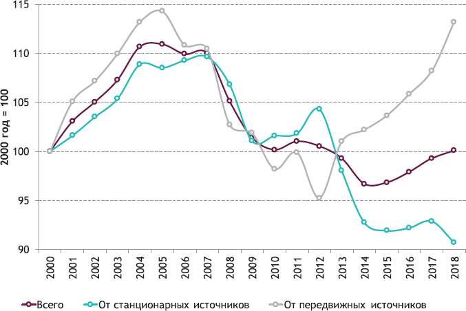Рис. 1. Динамика выбросов загрязняющих веществ в атмосферу в период 2000–2018 гг. [58]