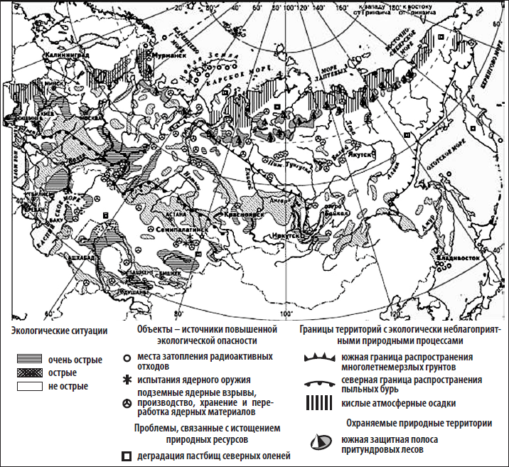 На рисунке 3 представлены редко публикуемые картографические данные локализации наиболее значительных экологических нарушений и неблагоприятных природных явлений, которые позволили рассчитать интегральный показатель степени экологической напряженности регионов [128].