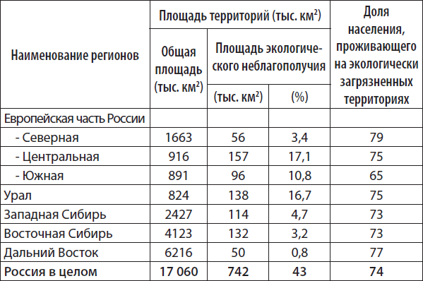 Экологически неблагополучные территории России и доли проживающего на них населения [277]