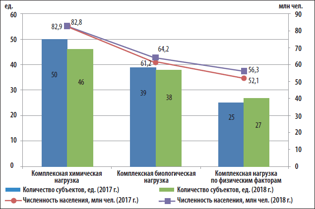 Согласно последним данным, ориентировочная численность населения РФ, постоянно подвергающегося вредному влиянию химических, биологических, физических факторов ОС, составила около 90 млн чел. [109]. Причем показатели комплексной химической нагрузки на население продолжают превалировать (рис. 5).