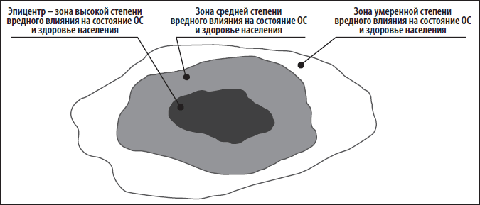 Обобщая приведенные выше данные, следует заключить, что высокие показатели загрязнения основных сред жизнеобитания населения регистрируются на протяжении многих десятилетий в большинстве промышленных городов РФ, являющихся источниками формирования вредных для здоровья загрязнений. В итоге вокруг большинства из них постепенно сформировались, как мы ранее отмечали, устойчивые очаги социально-экологической напряженности и развития экологически обусловленной патологии населения, что к настоящему времени представляет собою серьезную медико-экологическую и антропоэкологическую проблему. Указанные антропогенные очаги схематически могут быть представлены в виде следующей модели: эпицентра с источником (или источниками) постоянного загрязнения и расположенных вокруг него, как минимум, двух зон, которые могут быть достаточно ясно очерчены территориально, в зависимости от степени интенсивности и дальности распространения вредных выбросов. Естественно, что в пределах эпицентра могут регистрироваться сравнительно высокие концентрации вредных токсических выбросов и, следовательно, более выраженные последствия их вредного влияния на состояние ОС и здоровье населения.
