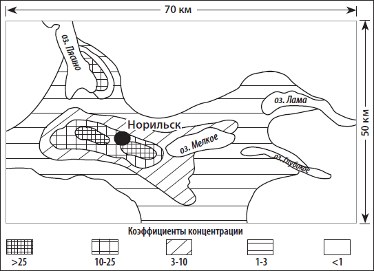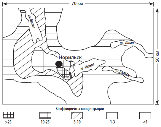Рис. 7. Загрязнение почвенного покрова Норильского промышленного района никелем [138]