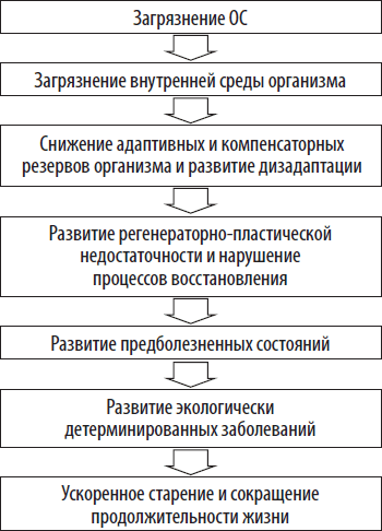 В итоге интенсивное и длительное воздействие вредных загрязнителей ОС сопровождается напряжением, перенапряжением и, наконец, истощением адаптационных возможностей организма, формированием состояния дизадаптации, что постепенно предрасполагает к развитию предболезненных состояний и хронизации основных патологических процессов (рис. 9).
