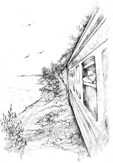 Потом опять потянулся дикий берег с выброшенными штормом корягами и черными пятнами кострищ. Вдоль воды, с опаской поглядывая на грохочущие вагоны, ковыляли бакланы, смахивающие на серых гусей с короткими шеями. Над морем метались жалобные чайки. Вдали, у горизонта, виднелись сиреневые силуэты кораблей, томящихся на рейде. А чистое синее небо перечеркивали две параллельные реактивные полосы, похожие на рубчатые следы шин в снегу.