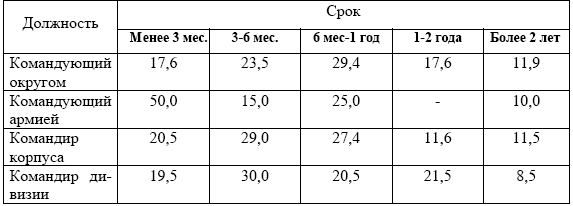 Срок нахождения в должностях (в процентном отношении) руководящего состава Красной Армии[44]