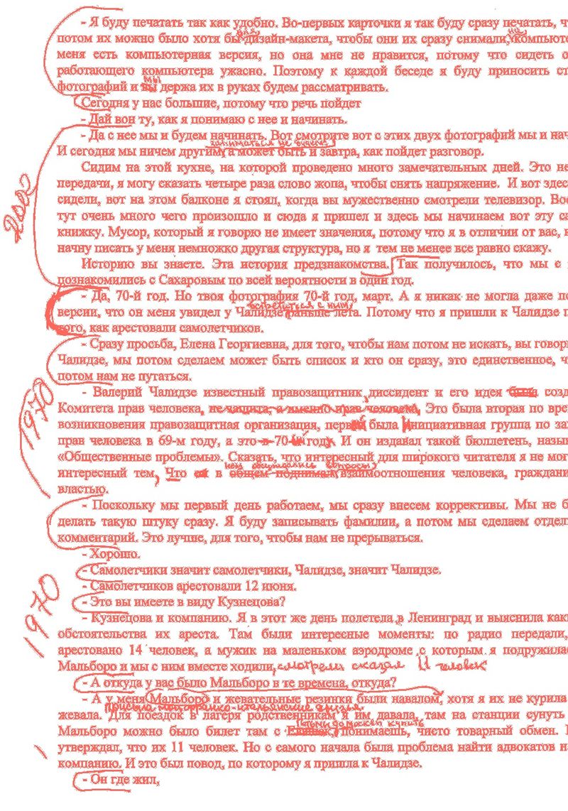 Весь июнь мы сидели на кухне, ели приготовленные ею котлеты и говорили о жизни и любви. Получилось 650 страниц машинописного текста. Я отдал его Елене Георгиевне и через несколько месяцев получил один экземпляр обратно с правкой фамилий и дат, со вставками и без единого сокращения.