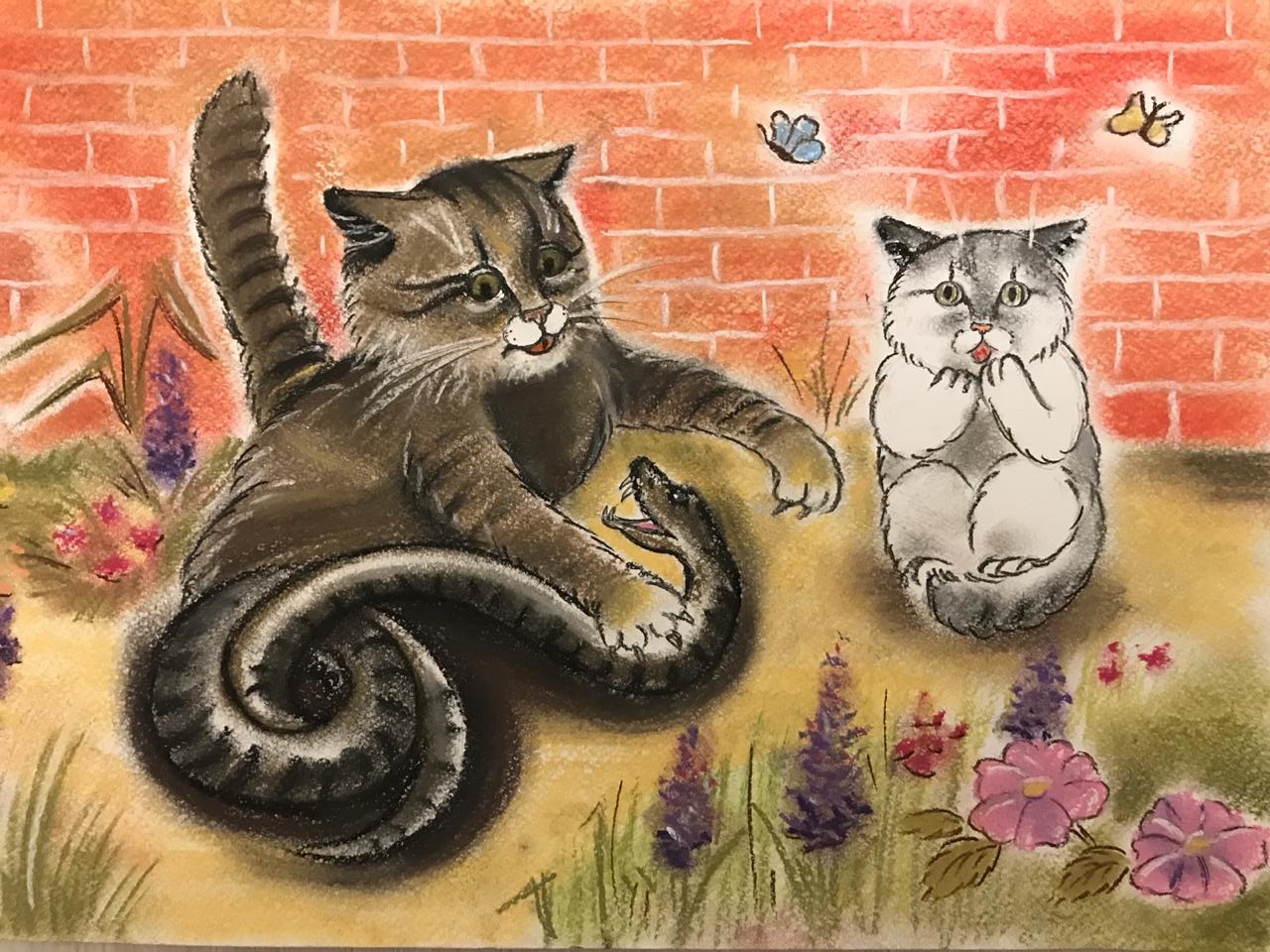 –Ладно, ты победила, отпусти меня. – Прошипела змея. Я ухожу жить к реке и больше не приду в сад к смелой кошке. И она поползла за ограду, а кошка дёргала её за хвост, приговаривая: « Не приходи больше, а то хуже будет»!