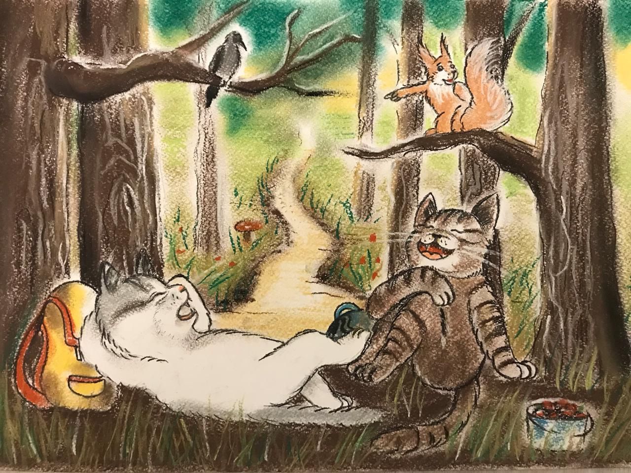 А кошки пришли в лес. В лесу было тихо и таинственно. Только переговаривались синицы, и стучал дятел. Белки посмотрели с дерева, никогда они не видели кошек.
