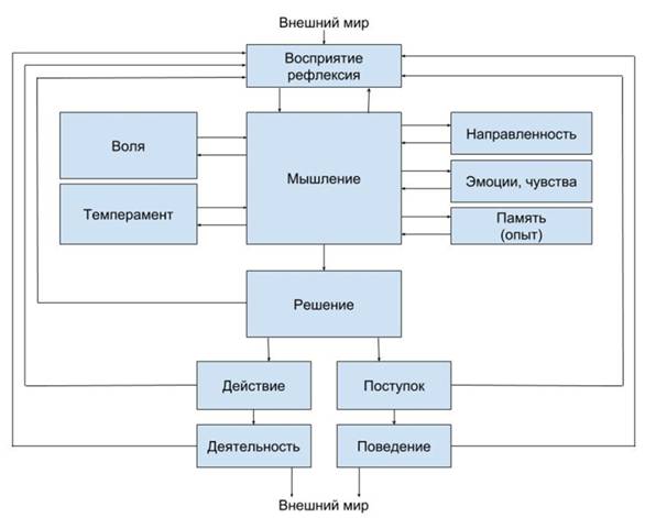 С учетом вышесказанного становится возможным, объединив все блоки в определенной взаимосвязи между собой и отразив взаимодействие личности с внешним миром через поступки и поведение, действия и деятельность, представить схему структуры личности.