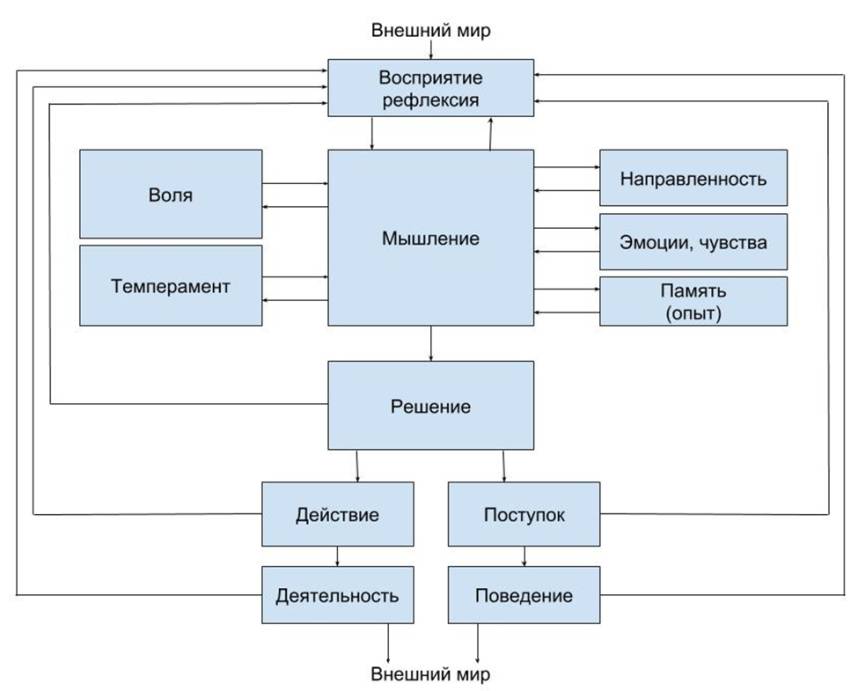 Из начала определения понятия мышления видно, что оно, безусловно, зависит от восприятия и рефлексии, точнее от информации, которую мышление получает посредством восприятия и рефлексии. Далее, после получения информации происходит собственно процесс мышления. Как оно связано с другими блоками структуры личности?