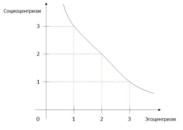 На графике показано, как в этом соотношении социоцентризм и эгоцентризм взаимосвязаны между собой. Рассмотрим три полюсных варианта таких соотношений, обозначенные на нем цифрами – 1, 2, 3.