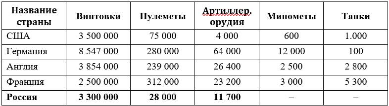 Из приведенных данных видно, что Россия в период 1-й Мировой войны выпускала средств для ведения современных боевых действий или недостаточно (самолеты, пулеметы, артиллерийские орудия), или по иностранным лицензиям и из иностранных комплектующих (те же самолеты, автомобили), либо вовсе их не производила (минометы, танки). (Мега Лекции. Промышленное развитие России к началу 1-й Мировой войны. Megalektsii.ru/s787t6.html).