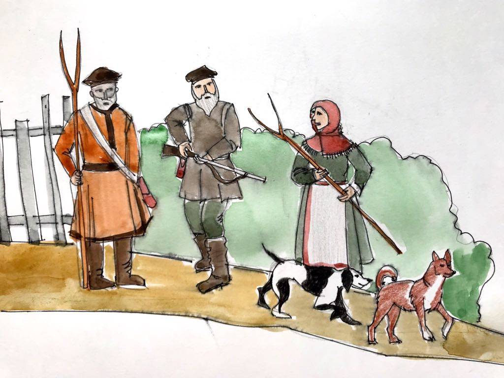 Взрослые решили пойти в лес и выследить медведя. Они вооружились палками и рогатинами, и взяли с собой собак, обученных брать след.