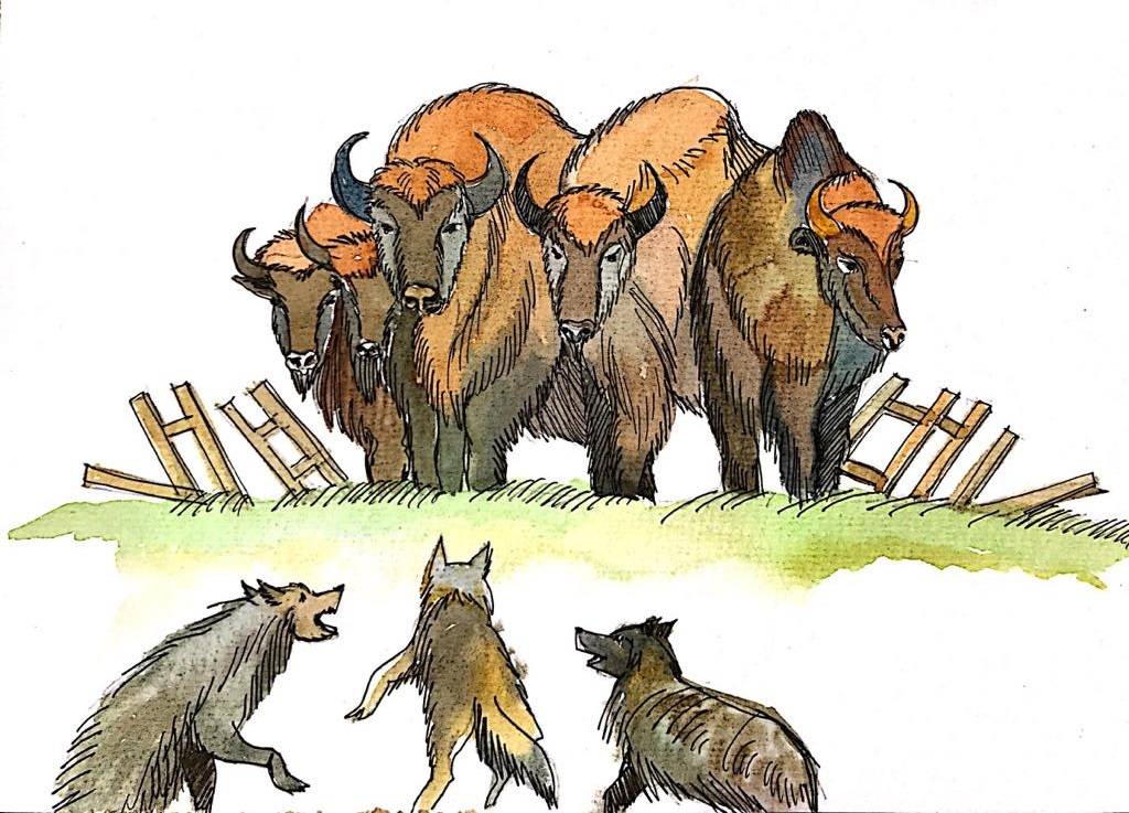 Волки начали медленно окружать Медведя в кольцо, и Бурый попятился в сторону изгороди. Внезапно раздался громкий-громкий топот, забор рядом с Бурым упал, и за спиной медведя появились пятеро здоровенных Зубров. Они выглядели, как огромные быки с небольшими, но очень острыми, крепкими и толстыми рогами на лбу. Каждый из Зубров был больше Медведя, а из-под шерсти буграми выступали крепкие каменные мускулы. Не дав опомниться стае Черных, Зубры ударили о землю передними копытами и кинулись на Волков.